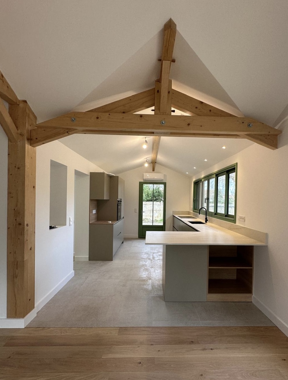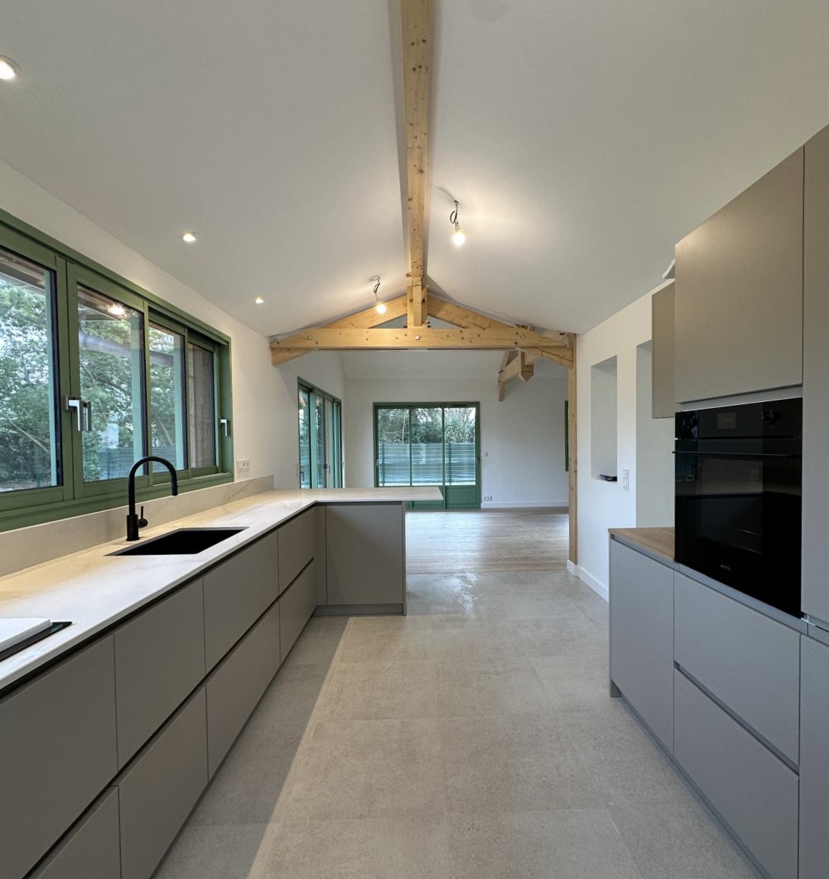 Le projet d’extension en ossature bois s’articule autour d’une distribution centrale baignée de lumière grâce à la pose d’une grande verrière. La pièce à vivre et la cuisine bénificient de plafonds rampants avec charpente apparante. Une façade Sud est largement ouverte sur le jardin, favorisant ainsi les échanges entre intérieur et extérieur.